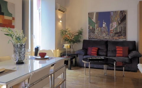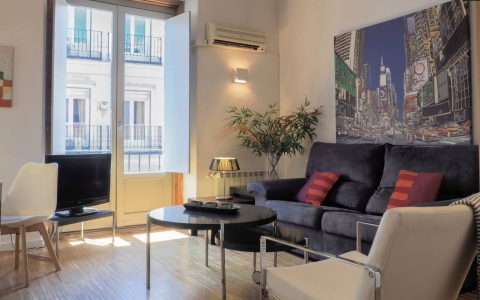 This chic 3-bedroom apartment is located in the centre of Madrid, in an area with well-known tapas bars and restaurants. Metro stations Sol and Tirso de Molina are a few minutes away. Furthermore, residents also benefit from having the renowned Plaza Mayor and Puerta del Sol within a 5-minute walk. The building has been fully renovated to a high standard. The refurbishment of the apartament includes the original restored columns and beams and modern features.
